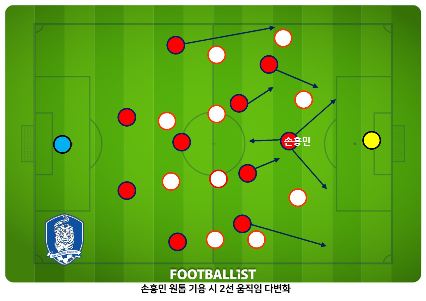 대표팀에서 자신의 기량을 100% 발휘하지 못했던 손흥민이 토트넘에 돌아가 신바람 득점행진을 할 수 있었던 배경은, 동료가 다르기도 하지만 그에게 주어진 역할이 다르기 때문이기도 하다. 대표팀에서 손흥민은 좌측면에서 패스를 이어 받아 이미 그의 진입 시도를 알고, 기다리고 있는 수비를 상대해야 한다.