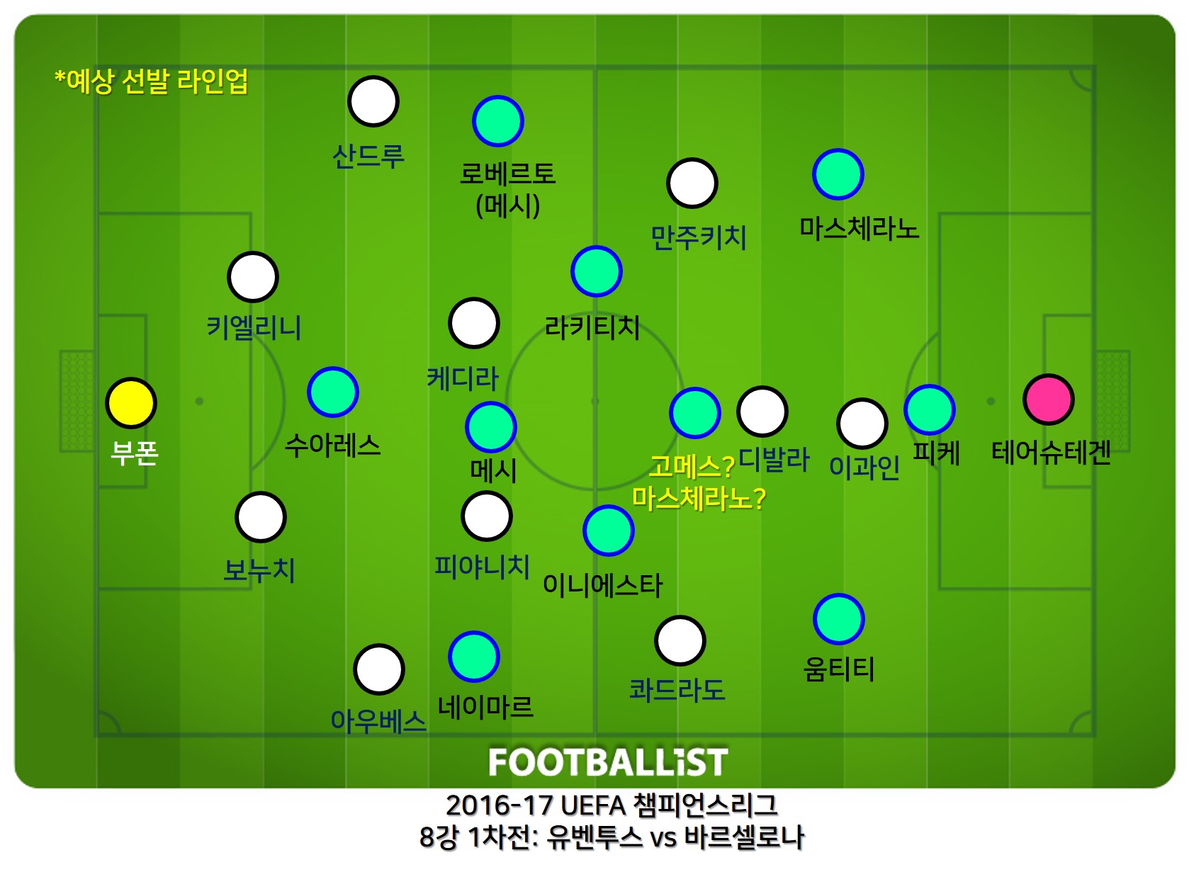 바르사의 선발 명단에 변수가 큰 가운데, 유벤투스는 기존 베스트 멤버의 기용이 유력하다. 잔루이지 부폰이 골문을 지키고, 알렉스 산드루-키엘리니-보누치-아우베스가 포백이다. 케디라와 피야니치가 두 명의 중앙 미드필더로 서고, 마시밀리아노 알레그리 감독의 공언대로 “네 명의 공격수를 배치한다.”