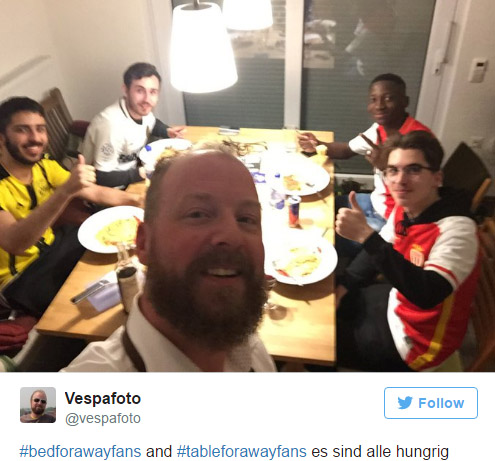 일부 도르트문트 팬들은 모나코 팬들에게 집을 개방했다. 현지 기자 중에서도 소셜미디어를 통해 “아직 숙소를 구하지 못한 사람은 내게 연락하라”는 메시지를 보낸 사람이 있었다. 아예 모나코 팬들에게 저녁 식사까지 제공한 팬은 “#어웨이팬들에게잠자리를 그리고 #어웨이팬들에게저녁식사를 모두 필요하다”고 이야기했다.