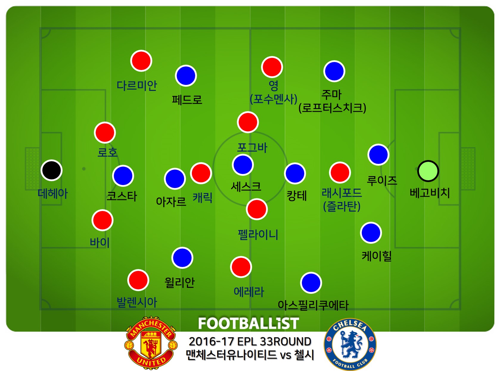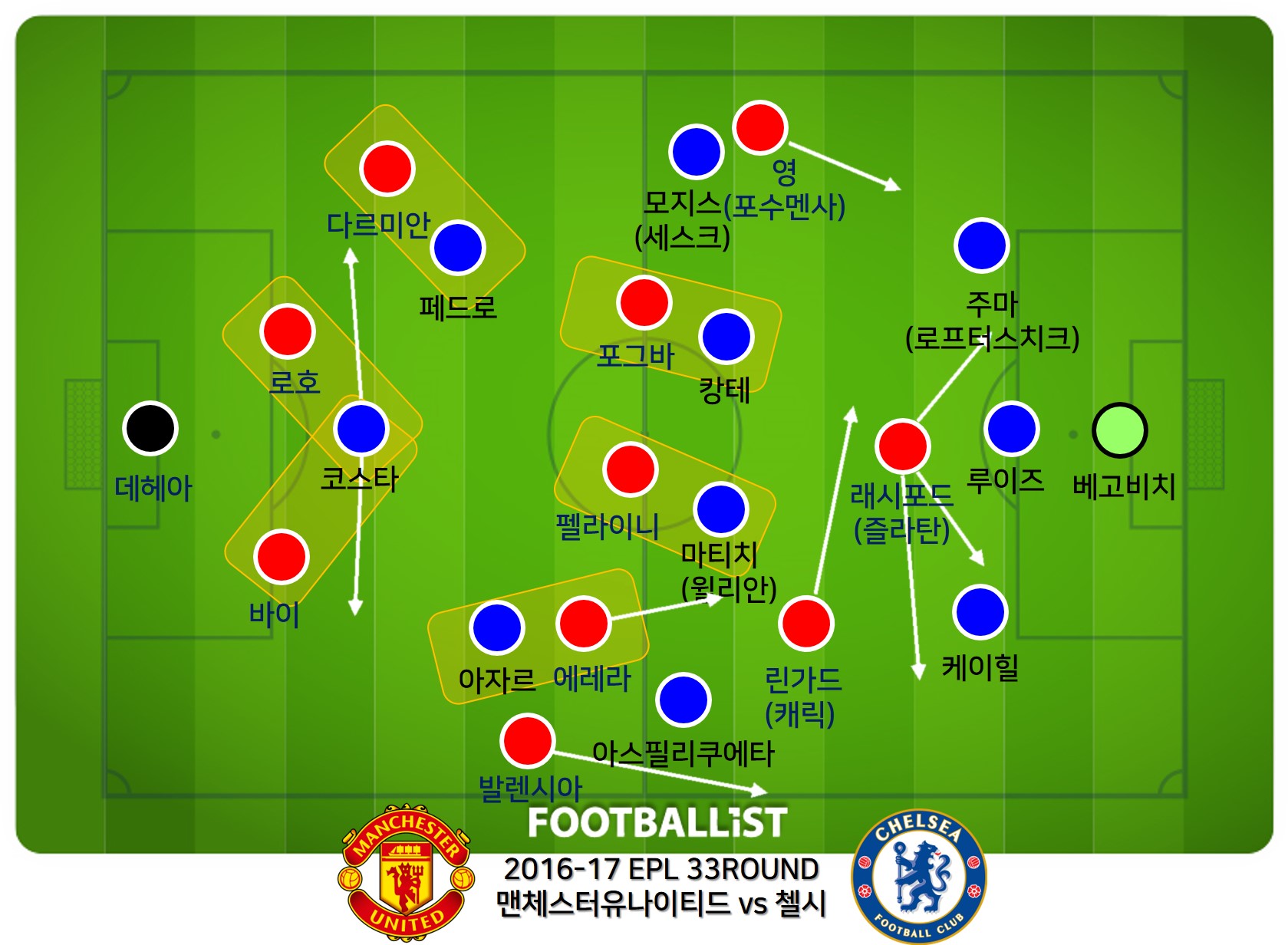 스리백 전술의 세계적 유행을 이끈 콘테 감독은, 핵심 윙백 마르코스 알론소의 부상 이탈에도 같은 방식으로 맨유 전에 임했다. 맨유와 전반기 리그 경기에서 4-0 승리, 불과 한 달 전에 있었던 FA컵 맞대결에서 1-0 승리를 거둔 콘테 감독의 입장에선 성공적으로 작동하고 있는 전술에 손을 댈 필요가 없었다.