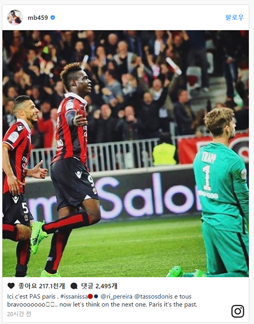 선제골을 터뜨린 발로텔리는 경기가 끝난 뒤 인스타그램 PSG를 자극했다. PSG 응원문구인 ‘여기는 파리’를 부정문으로 만들었다. 발로텔리는 경기 중에도 PSG 선수들에게 많은 이야기를 건네며 분위기를 주도했다. 발로텔리가 남긴 인스타그램 게시물에는 엄청난 좋아요와 댓글이 쏟아졌다. 그만큼 파장이 컸다.