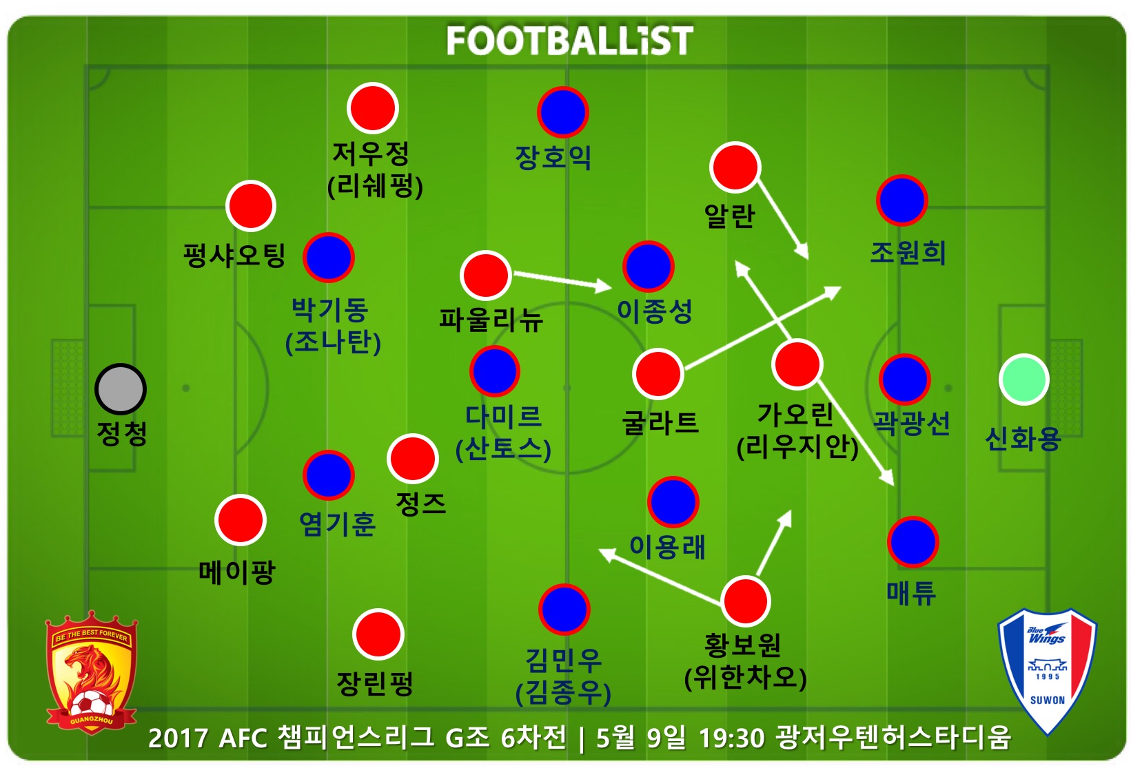 광저우는 수원의 공세에 대비해 풀백의 오버래핑을 제한하며 보수적으로 포백을 운영했다. 세 명의 브라질 선수들이 공격 전환 상황에서 활기를 보일 수 있는 조직을 구축했다.