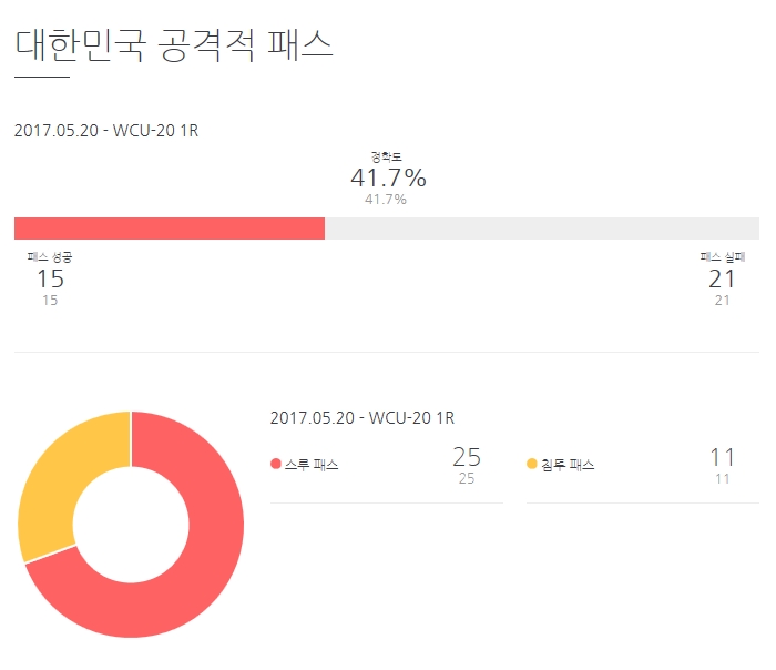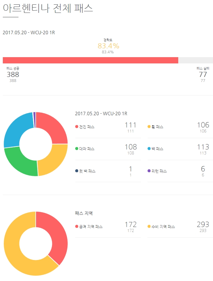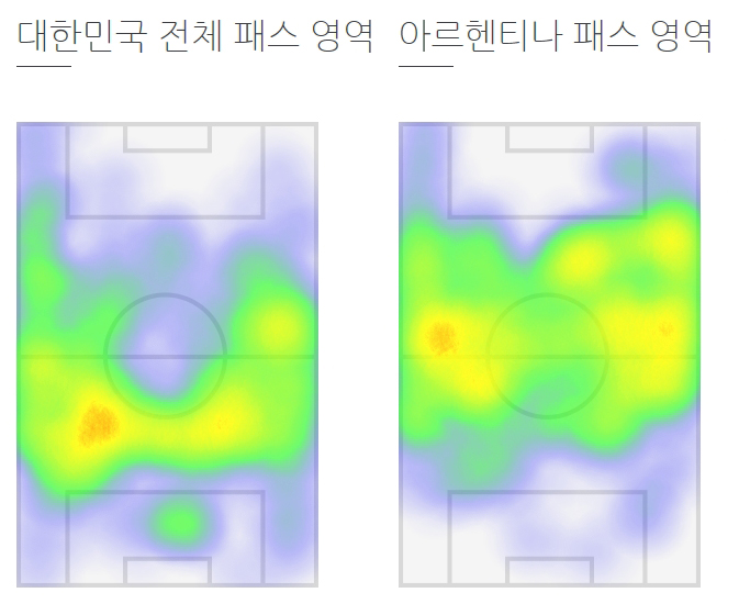 짧은 패스로 경기를 만들어간 아르헨티나의 패스 성공률은 83.4%로, 기니전에 한국이 기록한 80.2%보다 높다. 아르헨티나는 388회 패스를 성공했고, 77회 실패했는데, 한국은 312회 성공하고 77회 실패했다. 전체 패스 영역을 살펴보면 아르헨티나는 상대 지역에서 시도한 패스가 많다. 반면 한국이 높은 성공률을 기록한 것은 대부분 우리 수비 진영이었다.